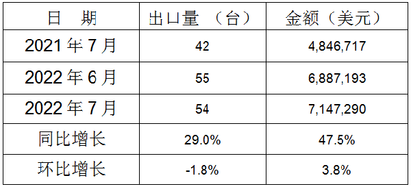 1-7月冷室壓鑄機共計出口279臺,同比增長11.6%。其中:7月份出口54臺,同比增長29.0%,環(huán)比增長-1.8%,見表9和表10。
